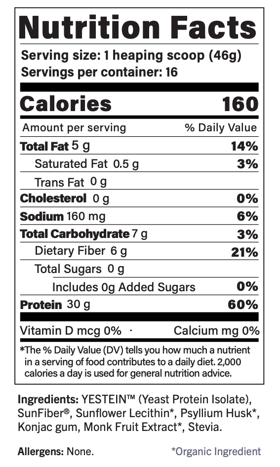 Ingredients: YESTEIN™ (Yeast Protein Isolate), SunFiber®, Sunflower Lecithin*, Psyllium Husk*, Konjac gum, Monk Fruit Extract*, Stevia.